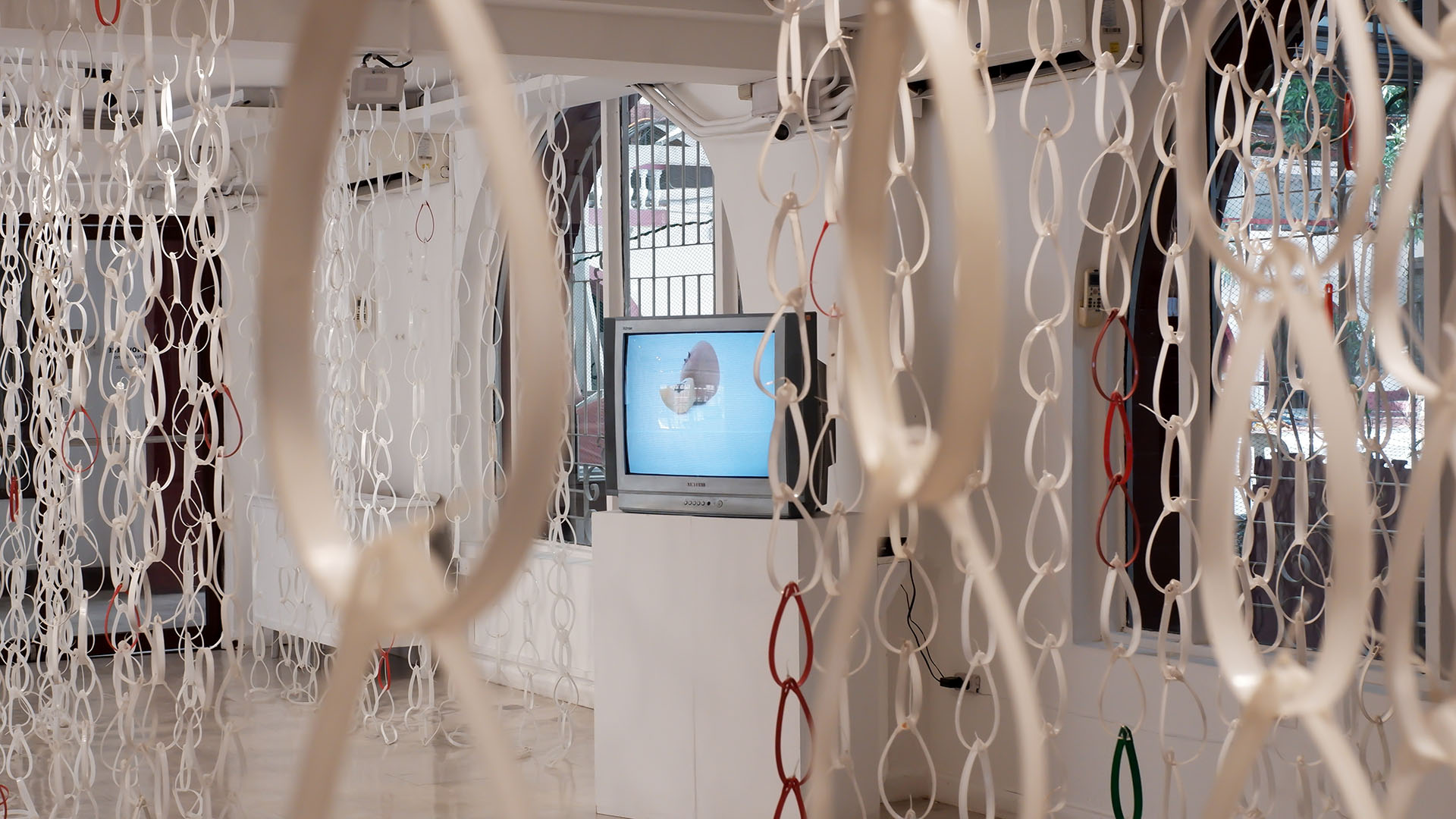 Blocking the videos and disrupting the space are paint bucket handles tied as if they are chains and droplets. Mishandled resonates with the disruptions to dreams and aspirations. Though there is always hope for the future, the current system continually destroys hope, designed to keep failing the populace.