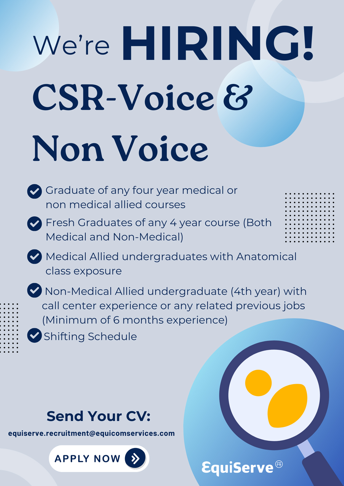 Equicom Services, Inc. is currently looking for a CSR & Healthcare Associate who can work on-site.