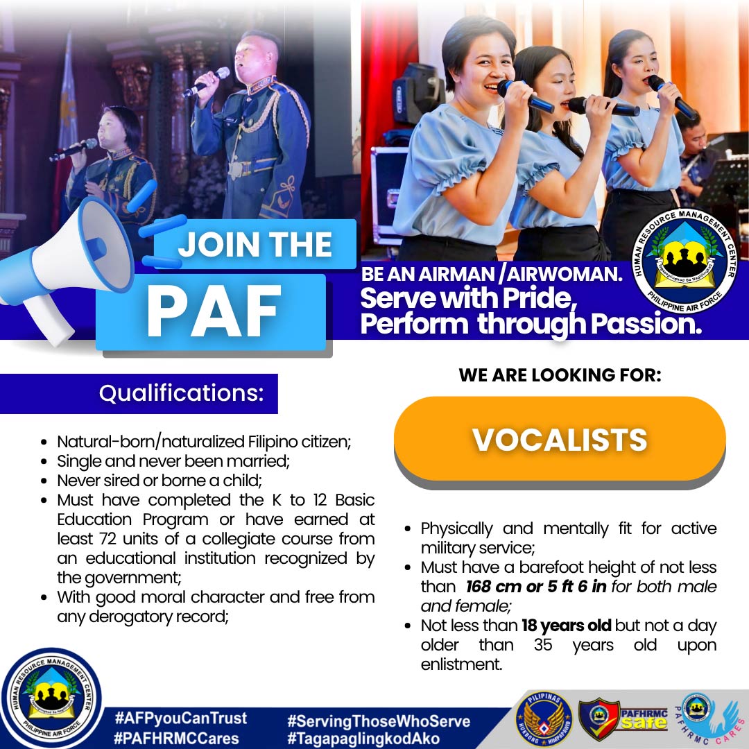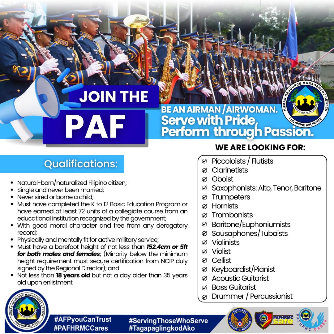Job Opening: Philippine Air Force Posted: OCT 14, 2024, 11:25 AM Download the PAF Recruitment for Special Enlistment Form